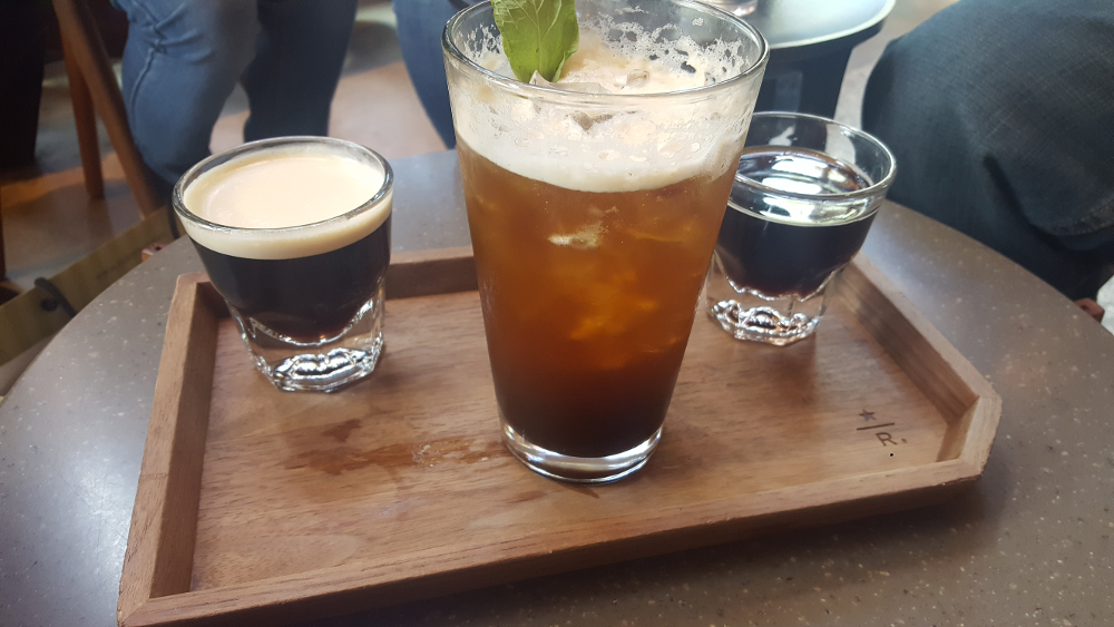 I ended up ordering an Iced Sparkling Espresso With Mint (“espresso, mint and demerara syrup served over ice and finished with sparkling water”) and a “Cold Bew Flight” of D.R. Congo Kawa Kabuya (“try the same single-origin coffee as straight cold brew & infused with nitrogen). I very much enjoyed both, but that sparkling espresso mint drink rocked my world, I highly recommend it – especially since it was only $6.50, I was worried that the beverages would be a lot more expensive, so yay 👍!